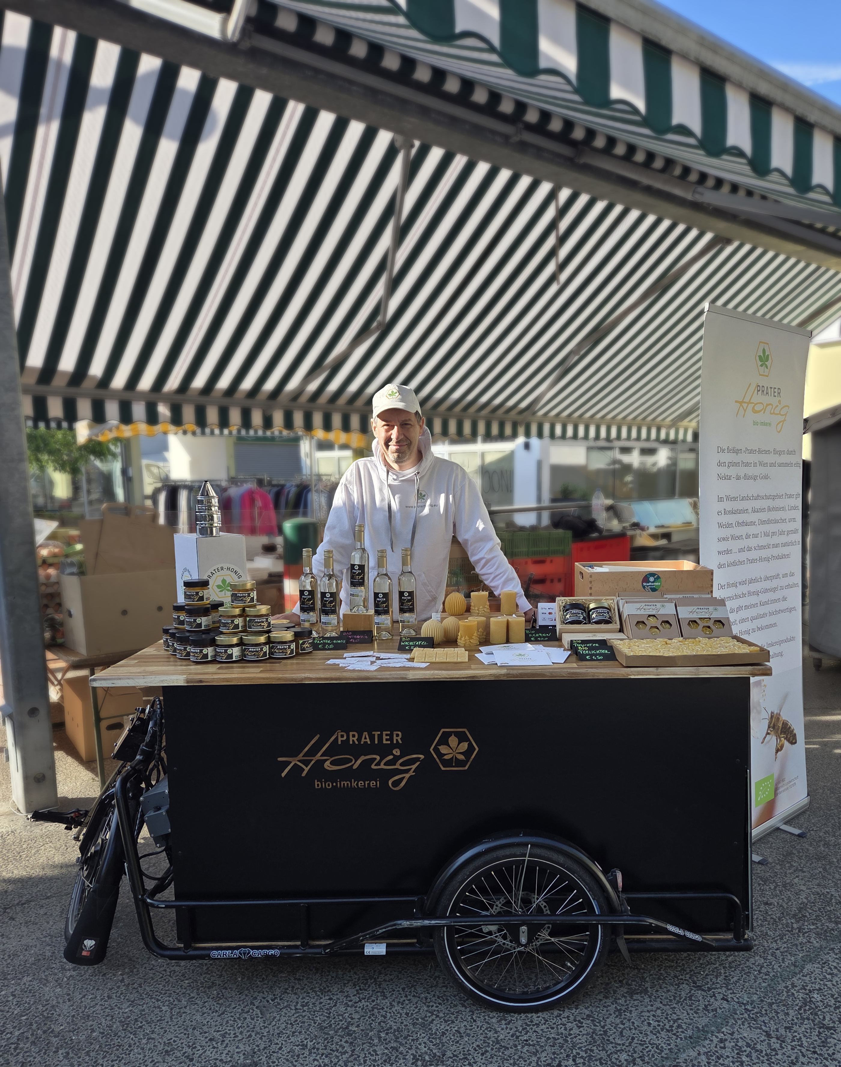 Foto: Bio-Imker Peter Blaha mit seinem Imker-Fahrradanhänger-Verkaufsstand am Vorgartenmarkt in der Leopoldstadt in Wien.